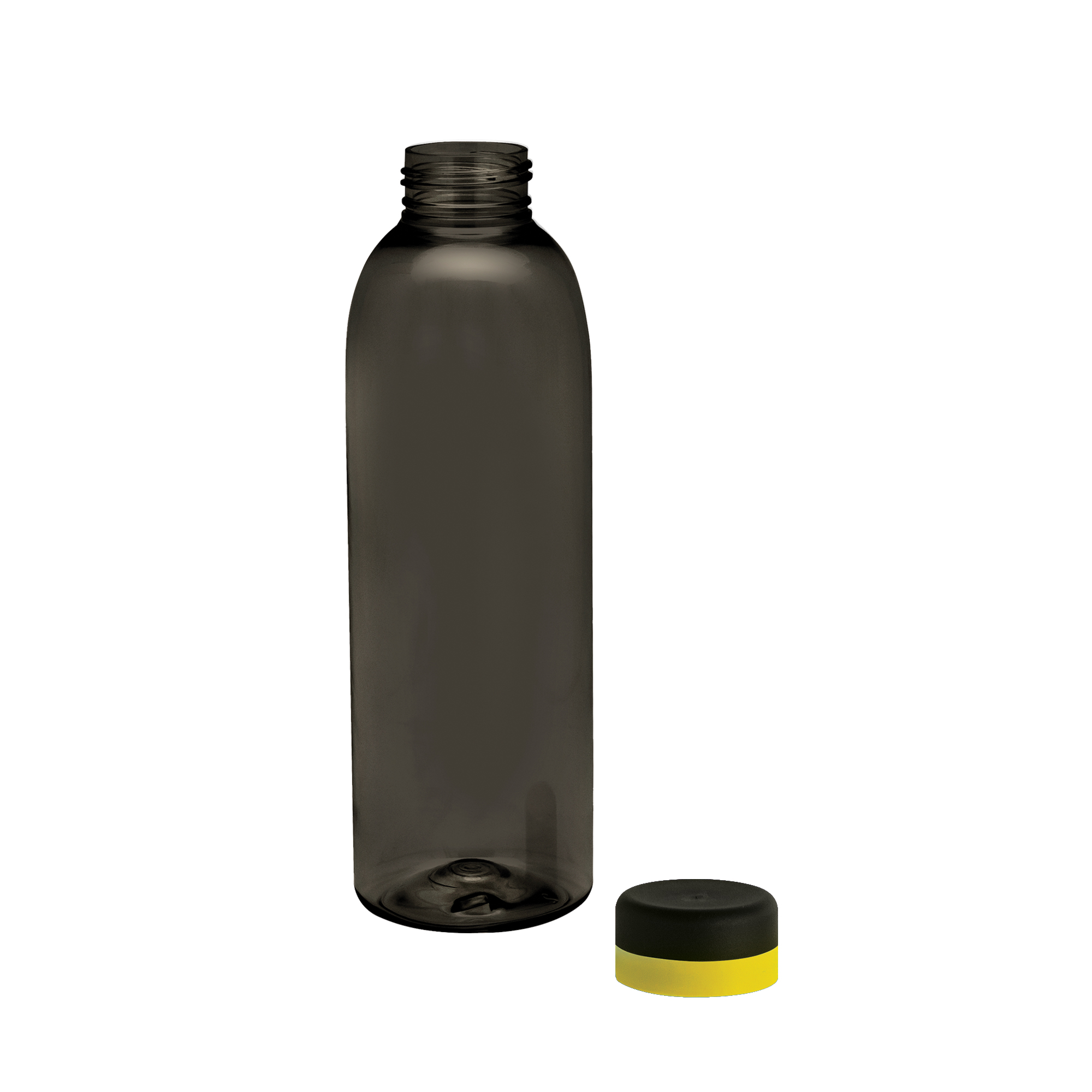 Botella de plástico de color negro translúcido con tapa a rosca color negro mate con anillo de silicona de diferentes colores.