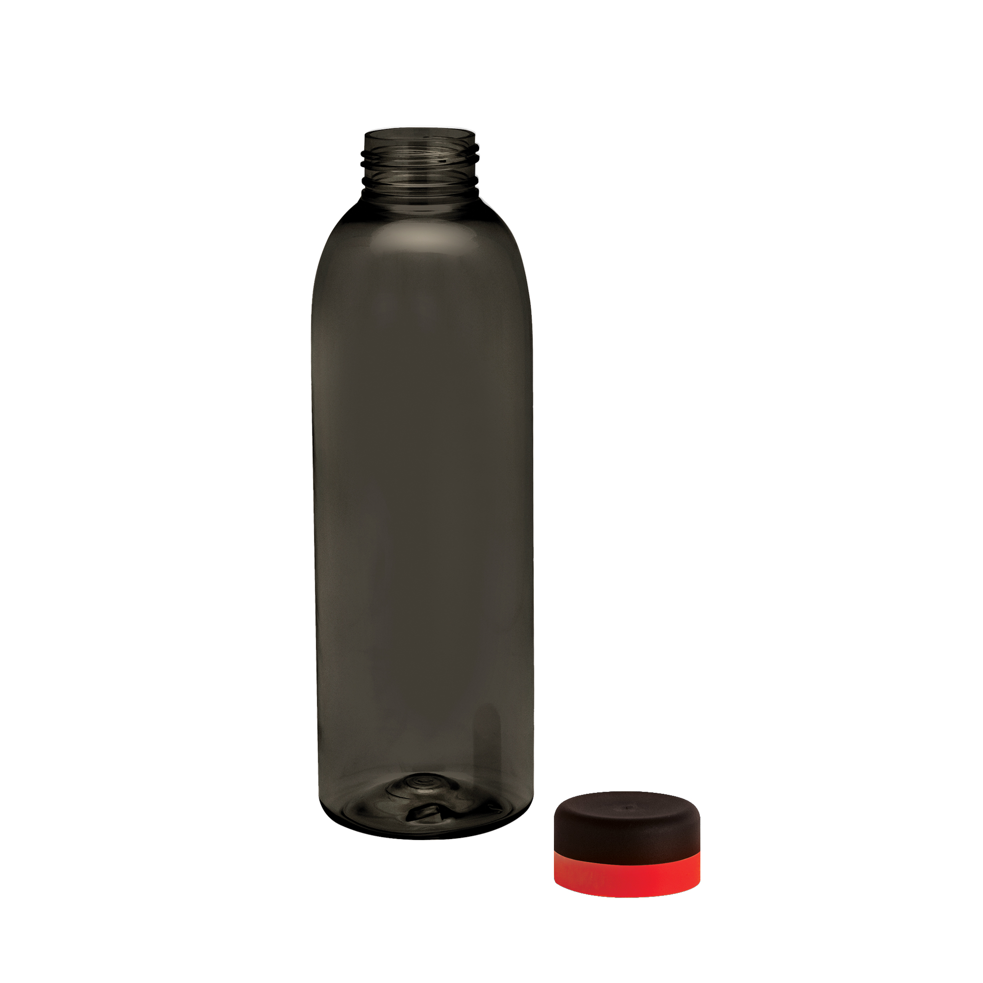 Botella de plástico de color negro translúcido con tapa a rosca color negro mate con anillo de silicona de diferentes colores.